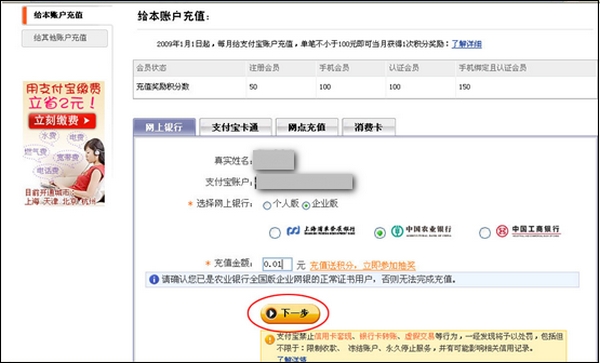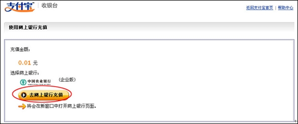 1、登录支付宝账户—我的支付宝—充值—网上银行,选择“企业版”—“中国农业银行”