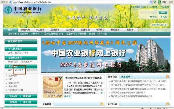 12、换操作员(该操作员必须具有复核权限),登录农行网银首页,网址:http://www.abchina.com,点击“电子商务--证书用户”登录
